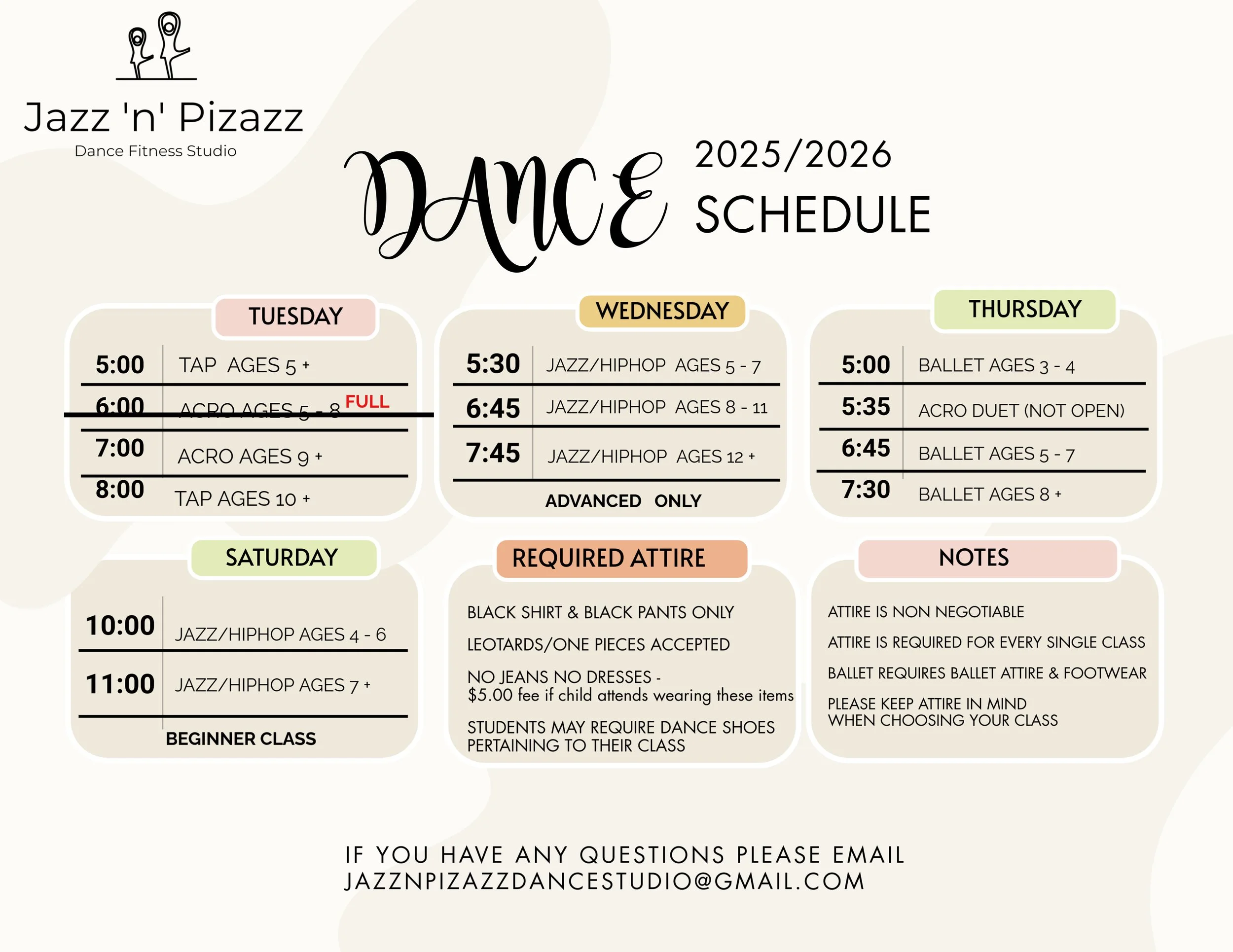 Jazz 'n' Pizazz Dance Studio reserves the right to use photographs and videos taken during classes, workshops, performances, or other affiliated events for the purposes of instruction, advertising and promoting Jazz 'n' Pizazz Dance Studio and its programs. Students, or parents of students who are minors, who do not wish to comply with this policy must notify Jazz 'n' Pizazz Dance Studio prior to participation in class Jazz 'n' Pizazz Dance Studio reserves the right to use photographs and videos taken during classes, workshops, performances, or other affiliated events for the purposes of instruction, advertising and promoting Jazz 'n' Pizazz Dance Studio and its programs. Students, or parents of students who are minors, who do not wish to comply with this policy must notify Jazz 'n' Pizazz Dance Studio prior to participation in class. Initial/Sign Below Acknowledging this section